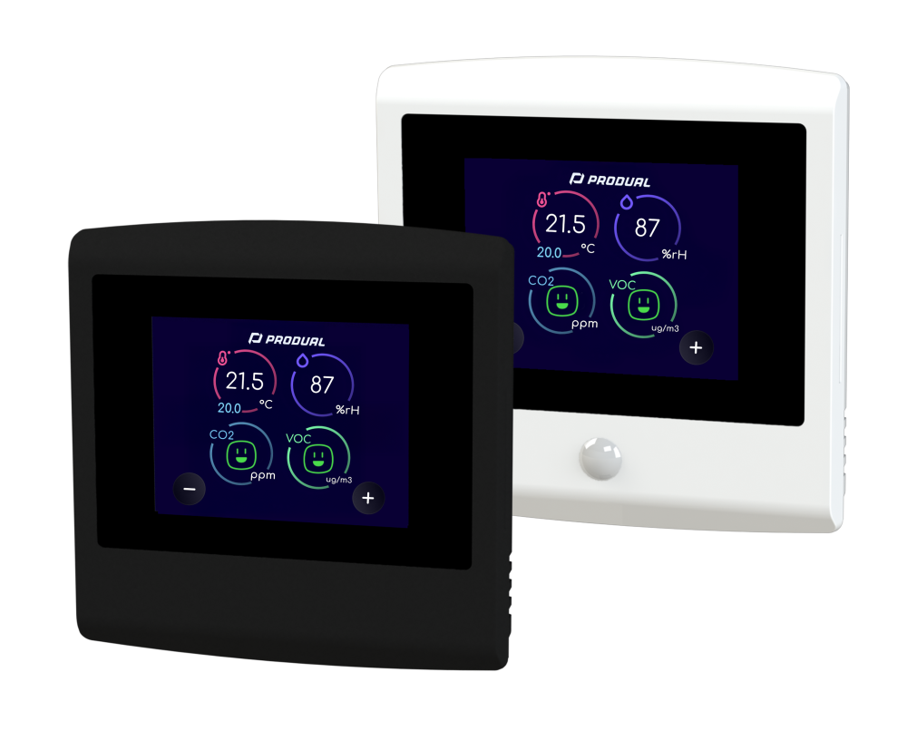De serie is leverbaar in verschillende meetcombinaties, waaronder temperatuur, relatieve vochtigheid, CO₂, VOC en PIR. Via MyProdual zijn configuratie en lifecycle-ondersteuning mogelijk.