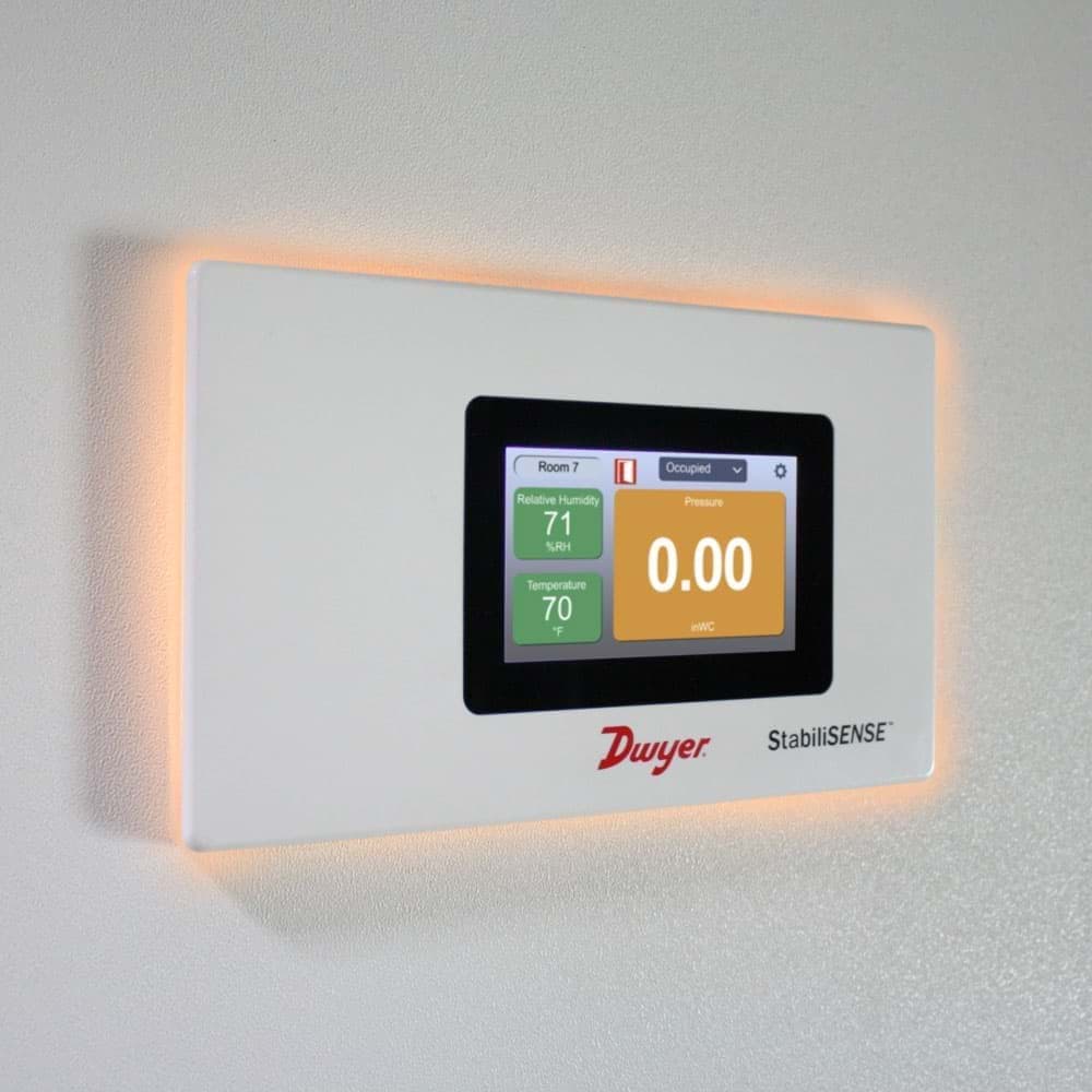The Dwyer RSMC Room Status Monitor Series is designed for critical applications with low differential pressures that also require immediate local visibility. The 4.3” full color touchscreen can be configured to measure positive or negative pressure in, for example, cleanrooms, hospitals, isolation rooms and laboratories. The Dwyer RSME Room Status Monitor is a complete solution with a touchscreen graphical user interface for displaying up to 4 parameters. Think of pressure, relative humidity, temperature, ventilation and/or door status. Standard equipped with the high-quality capacitive pressure sensor, resulting in an extremely high accuracy. There is a choice between ± 0.25% or ± 0.5% RSS. In addition, 2 analog inputs (0…10V or 4…20mA) for reading in a combined T/%RH transmitter or additional pressure transmitter(s). The graphical color changes on the display indicate the status per parameter at a glance. Within the set limit value the display and LED ring turn green, a pre-alarm is yellow and outside the limit value the display turns red. In addition, the room status monitor has an internal buzzer (69 dB). The RSME has a plastic bezel as standard, but is also available in a brushed stainless steel version. The RSME room status monitor comes standard with BACnet MS/TP and Modbus® RTU communication, but also has one digital (5A@30VDC) and one analog output (0…10V or 4…20mA).