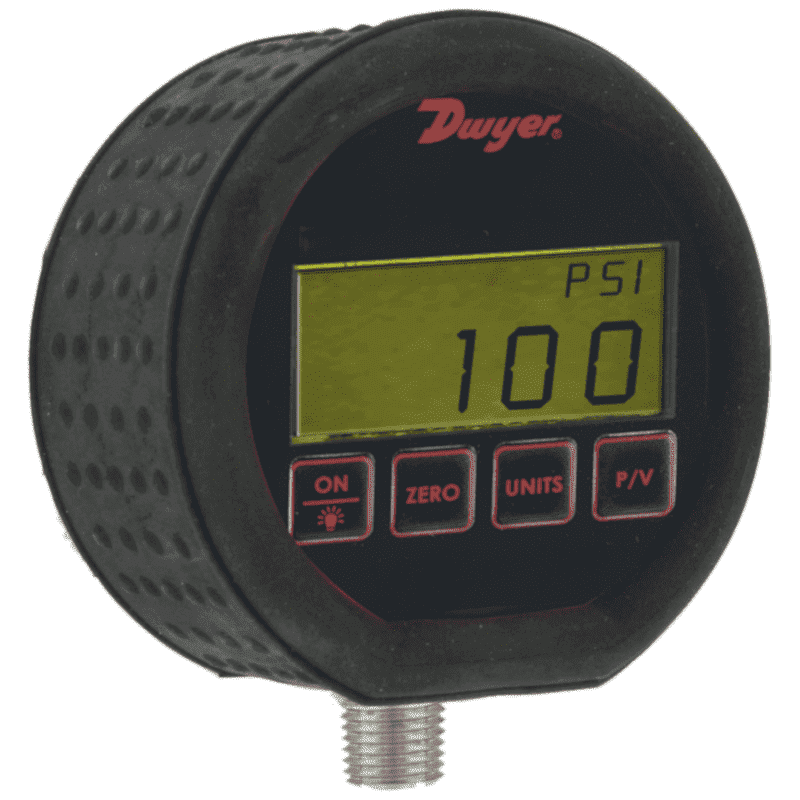 The Series DPG has a high ±0.25% full scale accuracy. The 4 digit digital display will reduce the potential for errors in readings by eliminating parallax error commonly produced with analog gages. Series DPG is battery powered and has an auto-shut off to conserve battery life. Battery life, on average, will last 2000 hours. A 4 button key pad allows easy access to features without the need to work through complex menus or difficult key combinations. These features include backlight, peak and valley, tare or auto zero and conversion of the pressure units.
