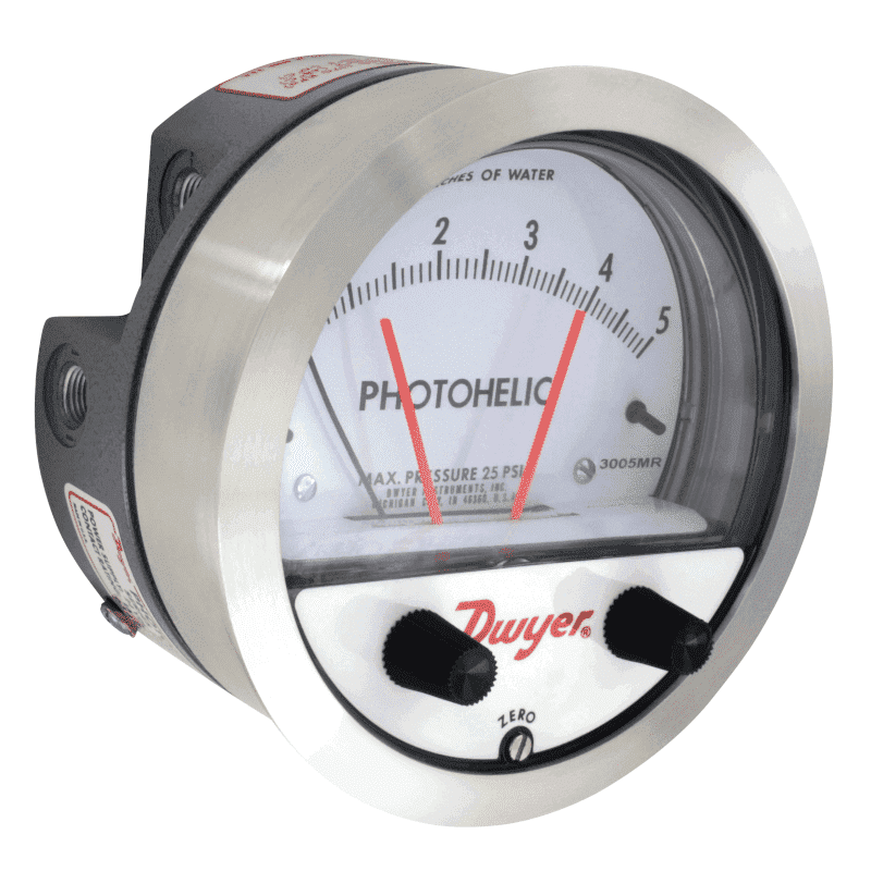 Dwyer Photohelic differential pressure gage with two limit switches Model: 3000MR-3KPA-24VDC Range: 0...3 kPa Max. pressure: 0,677...1,72 bar Max. temperature: -6,67?+48,9°C Contact: SPDT Power supply: 24 VDC Process connection: 1/8" NPTF