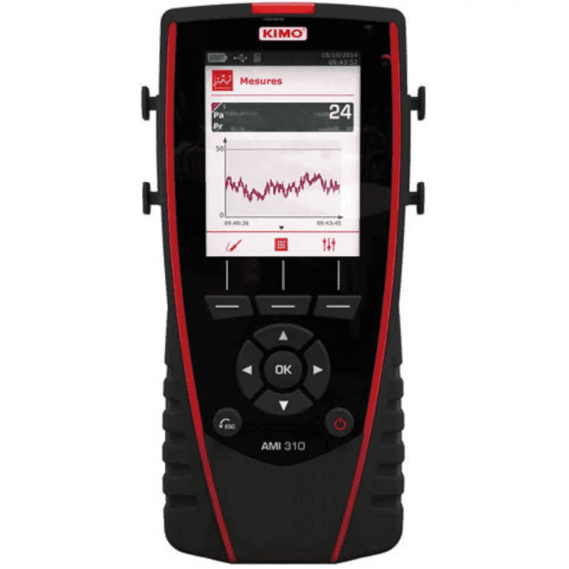 Kimo multi-function portable instrument with colour backlit graphic display Model: AMI 310 PRO 2 input channels for measuring probes and PT100 temperature probes 2 input channels for thermocouple K,J,T,S (-200 +1760°C) Output for PC and printer Supplied with: - pressure module: -500 ... +500 & 2...28 m/s - telescopic hotwire probe: 0,15...30 m/s - stainless steel hygrometry probe: 3...98% HR & -40...+180°C - telescopic vane probe Ø 100 mm.: 0,3...35 m/s - pitot tube, length 300 mm., Ø 6 mm. with integrated thermocouple K - 2x1 m. silicone tube (black and white) - stainless steel tube Ø 6 mm., length 100 mm. - 2 cables with mini-DIN connector for measuring probes - 2 lithium ion rechargeable battery with USB/mains adapter cable - Micro SD board - calibration certificate - transport case P/n 24755