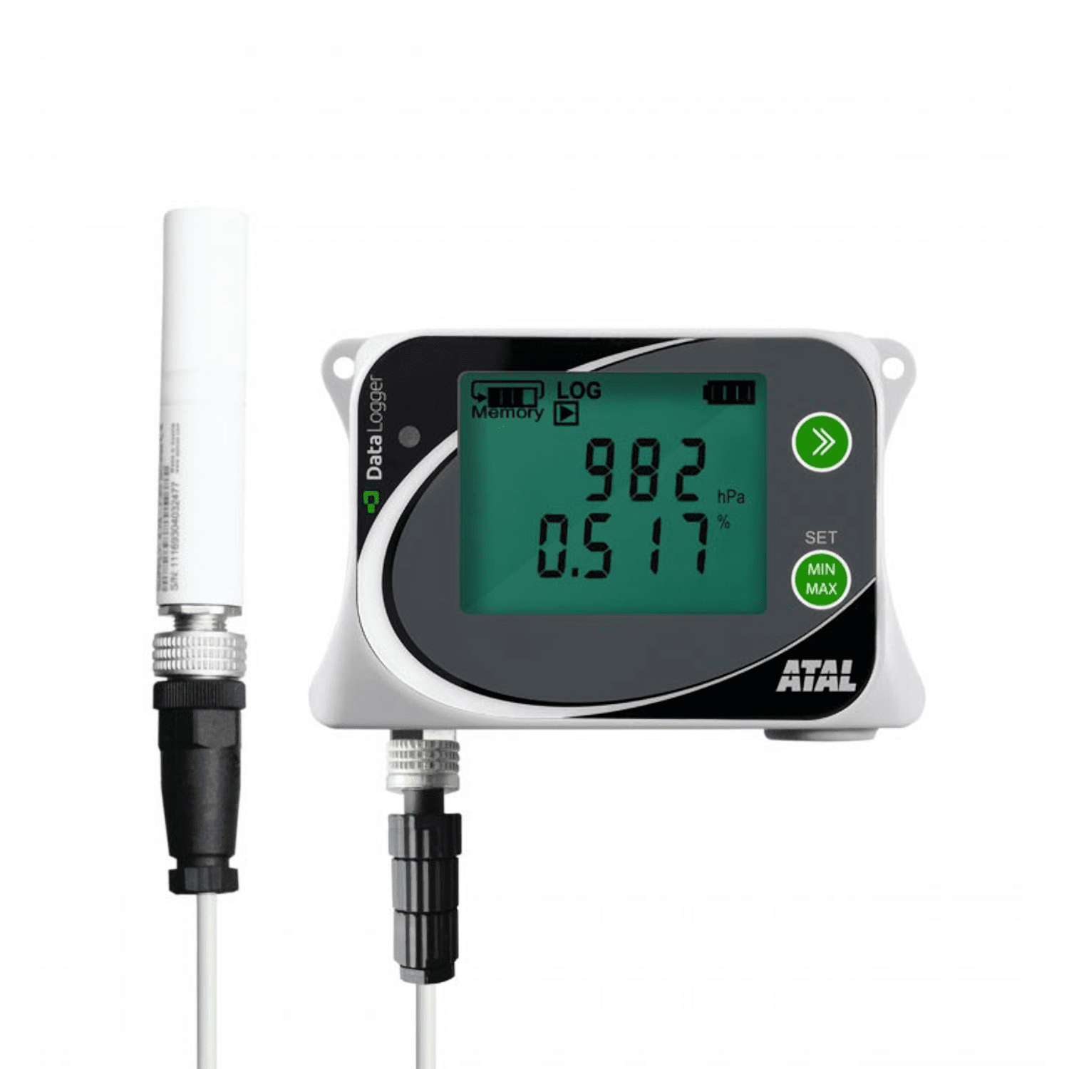 Datalogger met batterij en ingebouwde atmosferische druksensor, geschikt voor externe CO2-probes tot 10.000 ppm. Bij overschrijding van ingestelde limieten wordt er een alarm geactiveerd via LED, LCD en een ingebouwde pieper. De meetgegevens worden veilig opgeslagen in een niet-vluchtig elektronisch geheugen en kunnen eenvoudig via USB-C naar een pc worden overgezet.