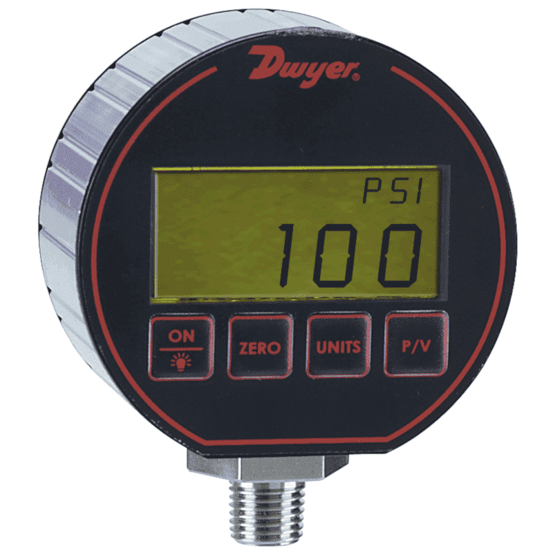 The Series DPG has a high ±0.25% full scale accuracy. The 4 digit digital display will reduce the potential for errors in readings by eliminating parallax error commonly produced with analog gages. Series DPG is battery powered and has an auto-shut off to conserve battery life. Battery life, on average, will last 2000 hours. A 4 button key pad allows easy access to features without the need to work through complex menus or difficult key combinations. These features include backlight, peak and valley, tare or auto zero and conversion of the pressure units.