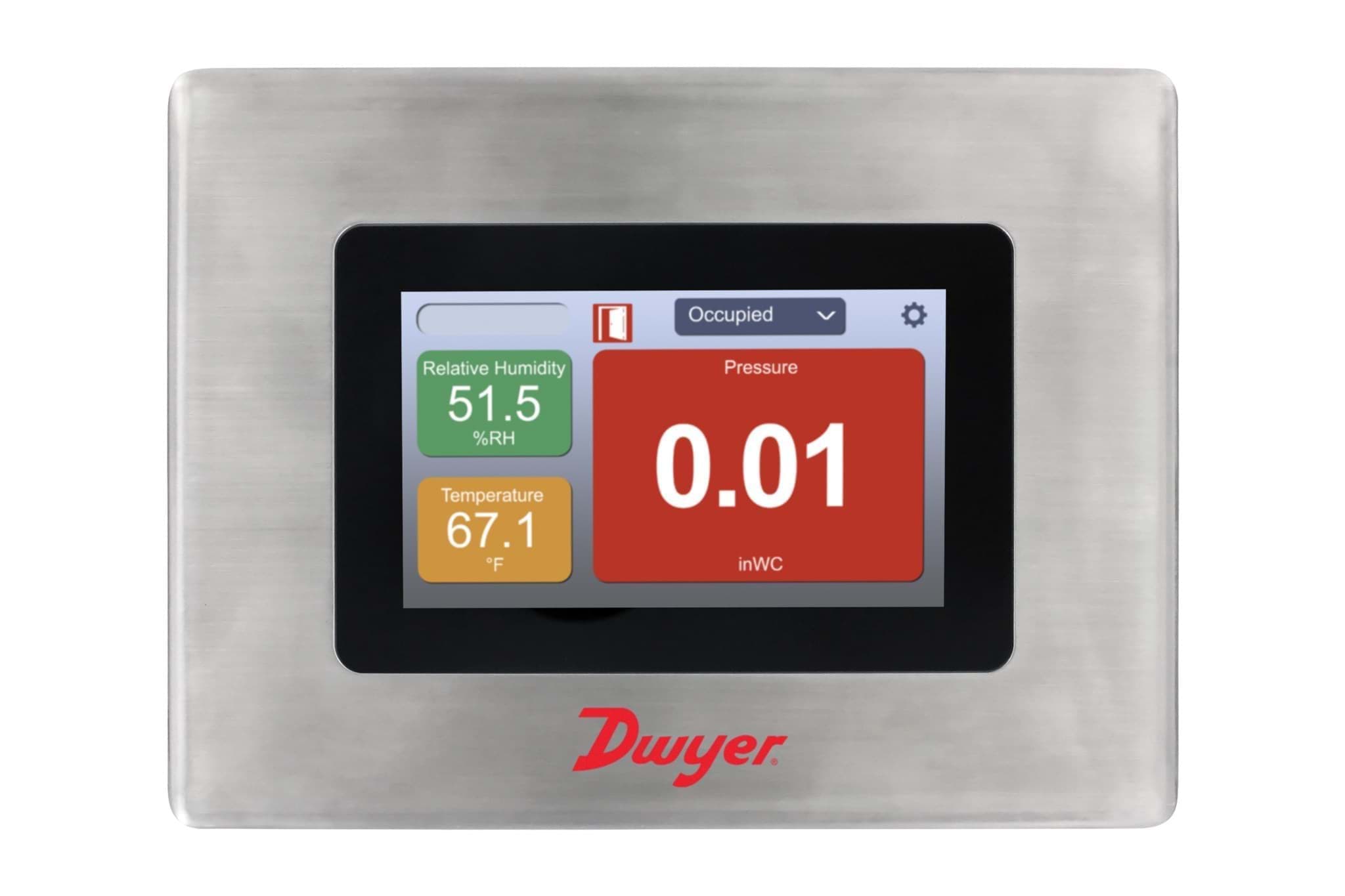 The Dwyer RSMC Room Status Monitor Series is designed for critical applications with low differential pressures that also require immediate local visibility. The 4.3” full color touchscreen can be configured to measure positive or negative pressure in, for example, cleanrooms, hospitals, isolation rooms and laboratories. The Dwyer RSME Room Status Monitor is a complete solution with a touchscreen graphical user interface for displaying up to 4 parameters. Think of pressure, relative humidity, temperature, ventilation and/or door status. Standard equipped with the high-quality capacitive pressure sensor, resulting in an extremely high accuracy. There is a choice between ± 0.25% or ± 0.5% RSS. In addition, 2 analog inputs (0…10V or 4…20mA) for reading in a combined T/%RH transmitter or additional pressure transmitter(s). The graphical color changes on the display indicate the status per parameter at a glance. Within the set limit value the display and LED ring turn green, a pre-alarm is yellow and outside the limit value the display turns red. In addition, the room status monitor has an internal buzzer (69 dB). The RSME has a plastic bezel as standard, but is also available in a brushed stainless steel version. The RSME room status monitor comes standard with BACnet MS/TP and Modbus® RTU communication, but also has one digital (5A@30VDC) and one analog output (0…10V or 4…20mA).