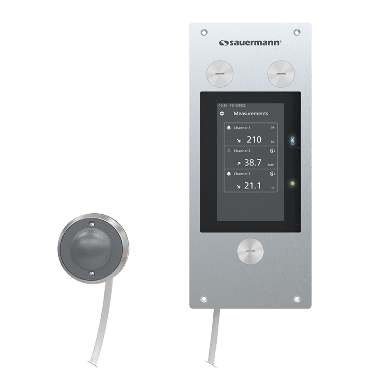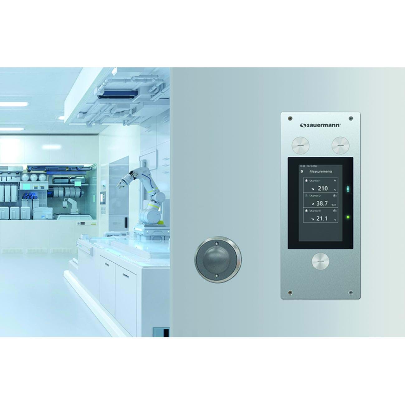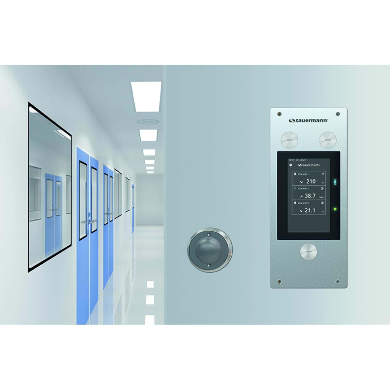 The Sauermann Si-CPE320 is excellent for use in clean rooms. It is possible to mount the transmitter completely flush-mounted so that no dirt or dust can remain on it. The transmitter features a waterproof front panel made of high-quality stainless steel with an integrated touchscreen and is resistant to cleaning with hydrogen peroxide.
